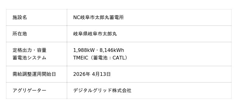 日本蓄電池株式会社(本社:東京都千代田区、代表取締役社長:漆原秀一、以下「日本蓄電池」)、デジタルグリッド株式会社(本社:東京都港区、代表取締役社長CEO:豊田祐介、以下「デジタルグリッド」)は、岐阜県岐阜市太郎丸に設置した系統用蓄電施設「NC岐阜市太郎丸蓄電所」について、2026年4月13日より需給調整市場向けの運用を開始したことをお知らせいたします。