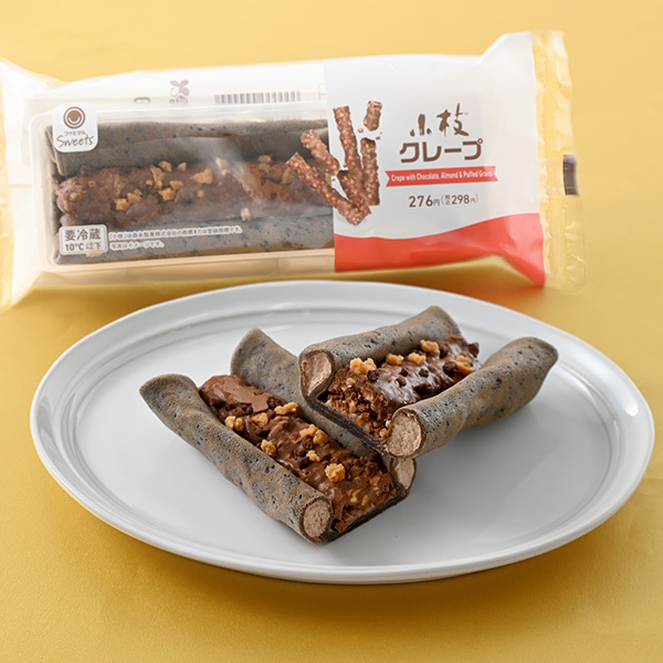 「小枝」をイメージしたクレープです。もちもちとした生地にチョコクリームやクランチを重ね、「小枝」をイメージしたチョコ掛けアーモンドパフをトッピングしています。