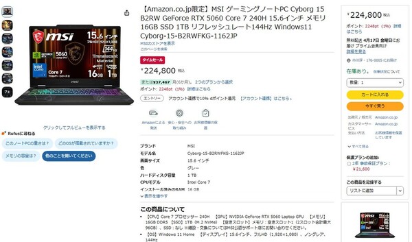 スペックを厳選でコスパ良し、RTX 5060搭載のMSI製ゲーミングノートがタイムセールで22万円台に