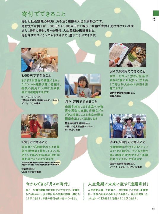 えんギフトは、年1回累計6.4万部以上を無料発行・配布する遺贈寄付専門の冊子で、社会課題に取り組む団体、大学、自治体への寄付事例や、寄付先の選び方、体験談などを紹介しています。