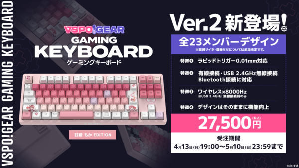 Brave groupは、次世代Virtual esports Project「ぶいすぽっ!」の公式ブランド「VSPO! GEAR」より、「VSPO! GEAR ゲーミングキーボードVer.2」を受注生産開始した。価格は27,500円で、受注期間は5月10日までだ。