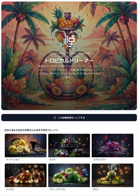 - 診断結果ページでは、あなたにマッチするミックス・フレーバー・店舗も同時にレコメンド