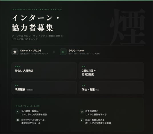 - KeMuCaアンバサダー:自分のSNSや現場の会話を通じて、KeMuCa(けむか)の魅力をシーシャコミュニティに広めてくれる方、POP設置や店舗宣伝プランを広めてくれる方、成果報酬型でリターンをお支払い。シーシャ愛があれば、職業やプレイヤーかどうかは問いません。