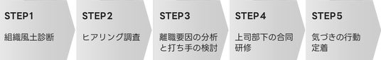 離職防止の取り組みは以下のステップで進めました。まずは組織風土診断によって、メンバーの関係性を見える化し、離職要因を考察しました。次に組織の実情を把握するために、気になる数名に絞ってヒアリング調査を実施。これらを材料に離職要因を掘り下げて分析し打ち手を提案しました。今回は「上司と部下のコミュニケーション不足」が主な離職要因の一つでしたので、上司と部下を交えた合同研修を実施して、お互いの相互理解を深めました。その後、1on1面談を数ヵ月継続して、研修での気づきを定着させました。