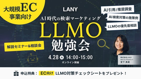 デジタルマーケティング支援を提供する株式会社LANY(東京都渋谷区、代表取締役社長:竹内渓太)は、【無料・少人数制】大規模EC事業者向け LLMO勉強会 ━ AI時代の検索マーケティング ━ を4/28(火)に開催いたします。