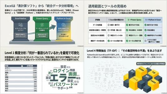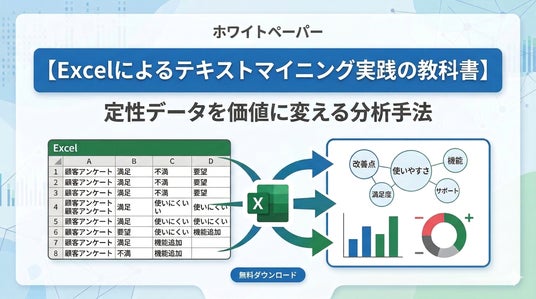本ガイドでは、アンケートの自由記述や顧客レビューといった「定性データ」を、高額な分析ツールやプログラミングを使わずに、普段使い慣れた「Excel」を使って定量化し、意思決定に直結させるための具体的な分析プロセスを紐解きます。