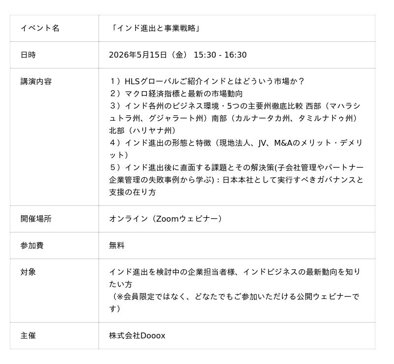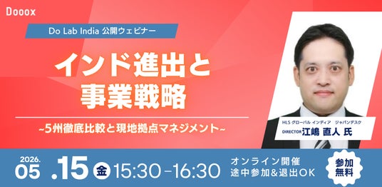 「行動で世の中を変えていく」を理念に掲げる株式会社Dooox(東京都品川区、代表取締役 久保寺亮介/以下「当社」)が運営するインド進出支援プラットフォーム「Do Lab India」は、この度、オンラインセミナー「インド進出と事業戦略」を2026年5月15日(金)にオンラインで開催いたします。