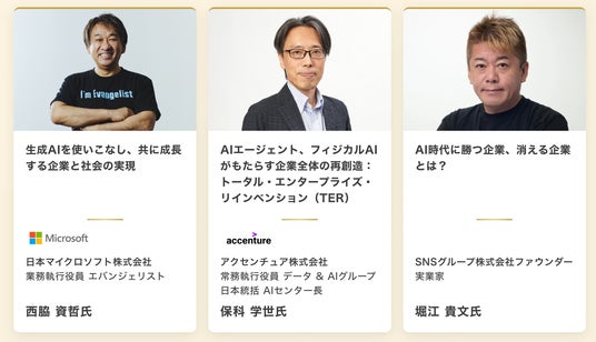 会場内では、AIの社会実装や企業変革に関する講演を多数実施予定です。日本マイクロソフト株式会社の西脇資哲氏、アクセンチュア株式会社の保科学世氏、実業家の堀江貴文氏など、各分野で注目を集める登壇者が、AI時代の企業戦略や活用の方向性について語ります。