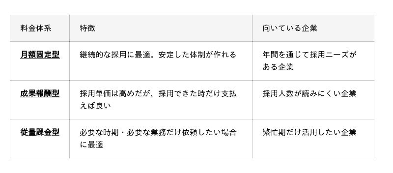 RPOの料金体系は主に3種類あり、自社の採用フェーズに合わせた選択が重要です。