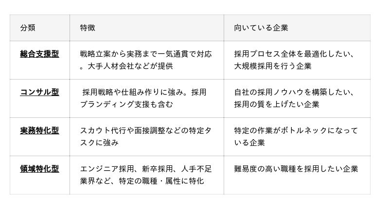 RPOサービスは、提供形態と強みによって大きく4つに分類でき、自社の採用課題に合った類型を選ぶことが成果を左右します。