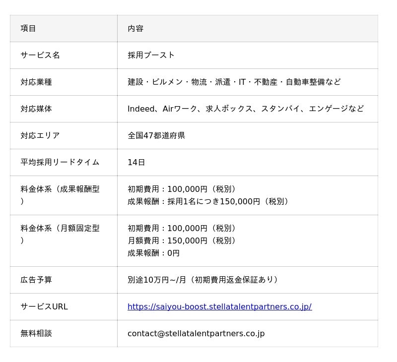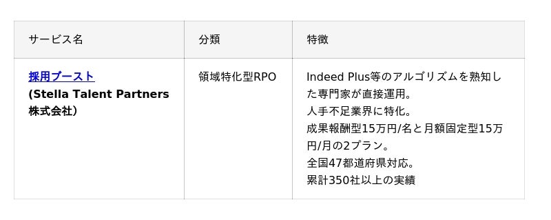 - Stella Talent Partners株式会社(採用ブースト) - RPOに特化した領域特化型サービスとして、Indeed Plus等のアルゴリズムを熟知した専門家による高い運用精度を提供。物流・施工・派遣・ドライバーなど人手不足業界に特化し、成果報酬型と月額固定型の2プランを用意。累計350社以上の運用実績があり、平均採用リードタイム14日。詳細は公式サイト参照