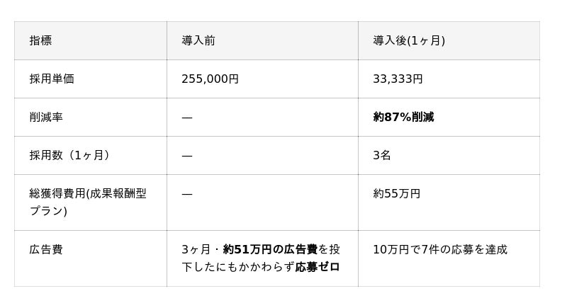 3ヶ月・約51万円の広告費で採用2件だったが、導入1ヶ月・約10万円で3名採用(最大7名見込み)を実現。