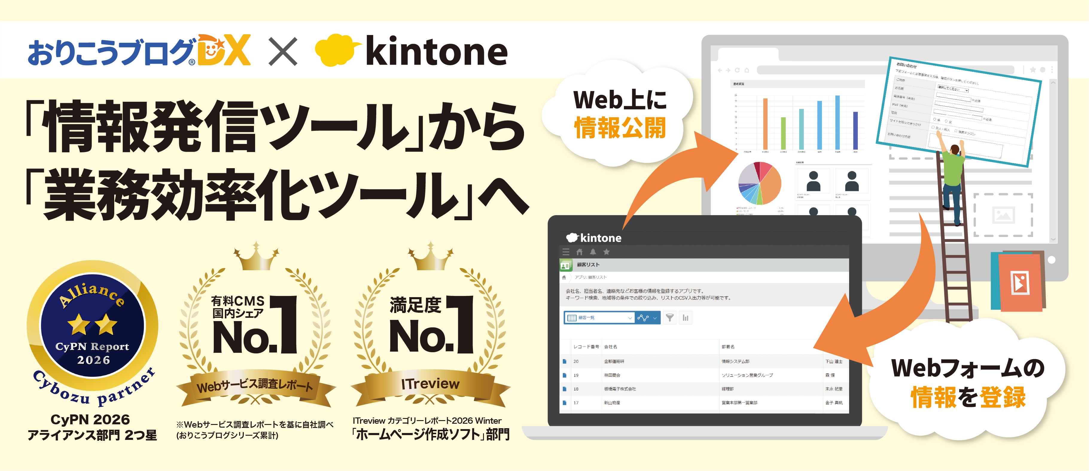 おりこうブログDXは、累計導入ライセンス数4万件を超えるWebサイト作成ツール『おりこうブログ』に、業務改善プラットフォーム『kintone』との連携機能を搭載したWebソリューションです 。