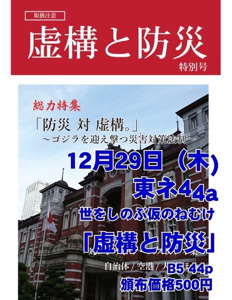 玉置: その後、内閣府防災に計9年在籍され、東日本大震災(2011年)や熊本地震(2016年)の最前線で指揮を執られます。東日本の時は東京で被災者支援や復旧・復興の政策を、熊本の時は現地に飛ばれたとか。そのあたりの「泥臭い現実」については後ほど詳しく伺いますが……やはり後藤さんといえば、コミケで頒布された『虚構と防災』の衝撃が大きいです。