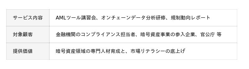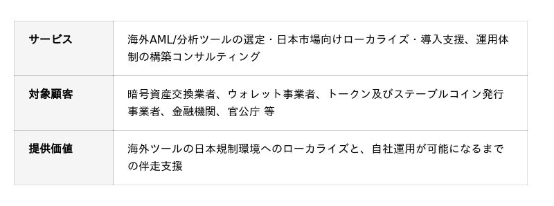 こうした制度変化に伴い、暗号資産交換業者のみならず、ウォレット事業者、ステーブルコイン発行事業者、資産運用会社、銀行・証券会社、官公庁など幅広い主体において、AML体制の整備やオンチェーンデータに基づく意思決定の高度化が急務となっています。一方で、日本市場に精通し、オンチェーン分析の専門知見と実務経験を兼ね備えた事業者は極めて限られているのが現状です。