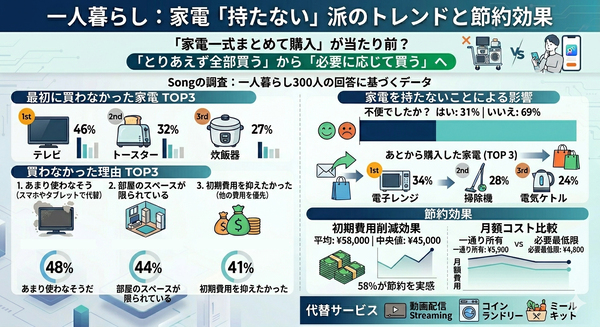 とはいえ、完全に不要というわけでもなく、電子レンジや掃除機のように「やっぱり必要だった」と後から購入されることが多い家電も存在します。最初から全部そろえるのではなく、実際の生活の中で“必要性を見極める”方向にシフトしているとも言えそうです。