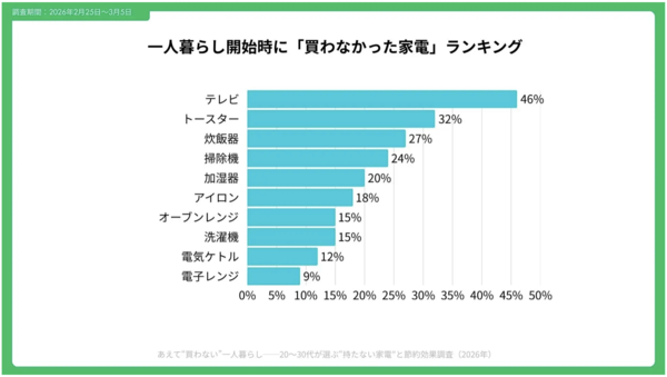 まず、「最初から購入しなかった家電」のランキングでは、1位がテレビ(46%)、2位がトースター(32%)、3位が炊飯器(27%)となりました。掃除機(24%)や加湿器(20%)なども上位に入り、生活必需性が相対的に低いと判断された家電が多く挙げられています。