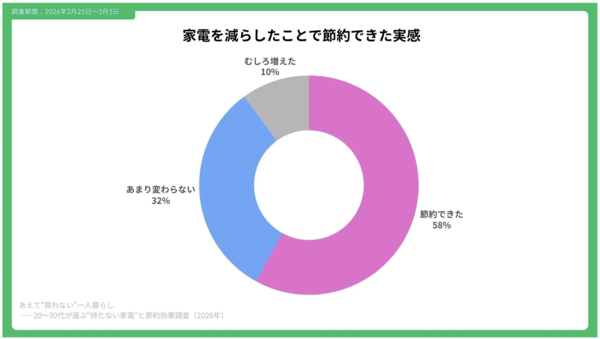 さらに、「節約できたと感じる」と回答した人は58%にのぼり、コスト面でのメリットを実感している層が過半数を占めました。