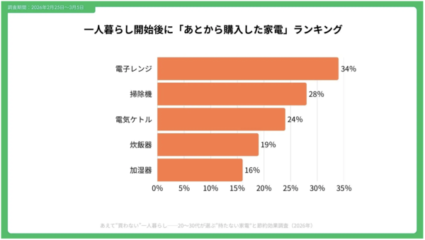 ただし、生活を始めた後に家電を追加購入するケースも多く、「あとから購入した家電」では電子レンジ(34%)、掃除機(28%)、電気ケトル(24%)が上位となっています。これらは、実際の生活の中で必要性が高まる傾向にある家電といえます。
