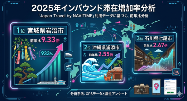 実際の調査データを見ると、その変化はかなりはっきりしています。とある調査では、インバウンドの滞在増加率ランキングの1位が宮城県岩沼市。しかも前年比9.33倍と、すさまじい伸びを記録しています。