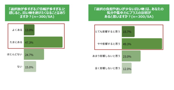 さらに、60.3%が「情報や選択肢が多すぎると買い物を避けたくなる」と回答しており、情報過多が購買行動そのものの抑制につながっている可能性も示唆されました。