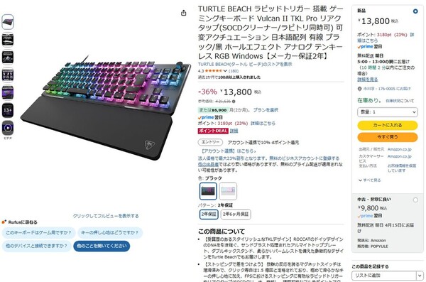 Amazon.co.jpにて、TURTLE BEACHのゲーミングキーボード「Vulcan II TKL Pro」が販売中だ。参考価格は2万1636円だが、執筆時点では36%オフの1万3800円で購入できる(4月14日時点)。