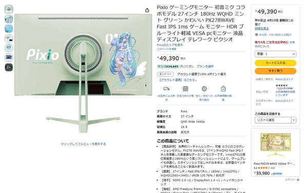 初音ミクとコラボしたPixio製27型QHDゲーミングディスプレー! みっくみくにされること間違いなしの一台
