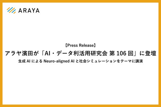 株式会社アラヤ(本社:東京都千代田区、代表取締役:金井良太、以下アラヤ)は、2026年4月24日(金)に開催される「AI・データ利活用研究会 第106回」に、NeuroAI事業部 ペルソナチームリーダーの濱田太陽が登壇することをお知らせいたします。本講演では、「生成AIによるNeuro-aligned AIと社会シミュレーション」をテーマに、神経科学とAIの融合研究や、LLMを用いた社会シミュレーションの最新動向について議論します。