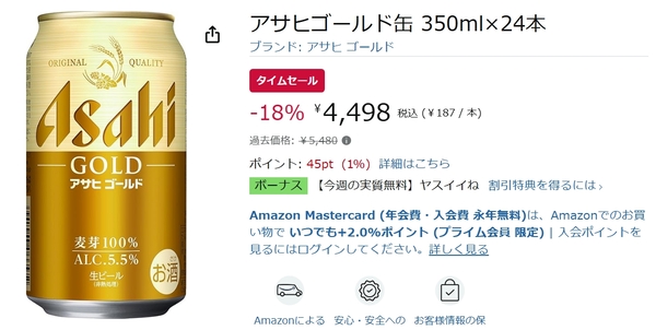 現在開催中のAmazonタイムセールで、「アサヒゴールド 缶 350ml×24本」が割引価格で購入できる状況です。