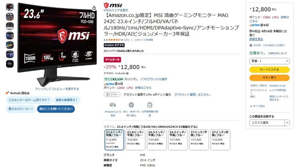 Amazon.co.jpにて、MSIの23.6型湾曲ゲーミングディスプレー「MAG 242C」が販売中だ。参考価格は1万8000円だが、タイムセールにより29%オフの1万2800円で購入できる(4月14日時点)。