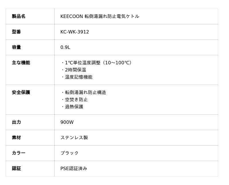 KEECOON転倒湯漏れ防止電気ケトル(KC-WK-3912)は、販売開始より好評を博しています。「転倒お湯もれ防止」機能搭載の温調電気ケトルについて、その人気の秘密を公開いたします。新安全基準に適応し、ドリップコーヒーの淹れやすさを考慮した「4mm細長い注ぎ口」とプロ仕様の1℃刻み温度調節機能を備えた本製品は、安心とこだわりを両立する「おうちカフェ」の必需品として、多くのユーザーに選ばれています。さらに、転倒湯漏れ防止構造や空焚き防止機能も備え、安全機能が充実していました。新しい生活を格上げするアイテムとして注目されています。