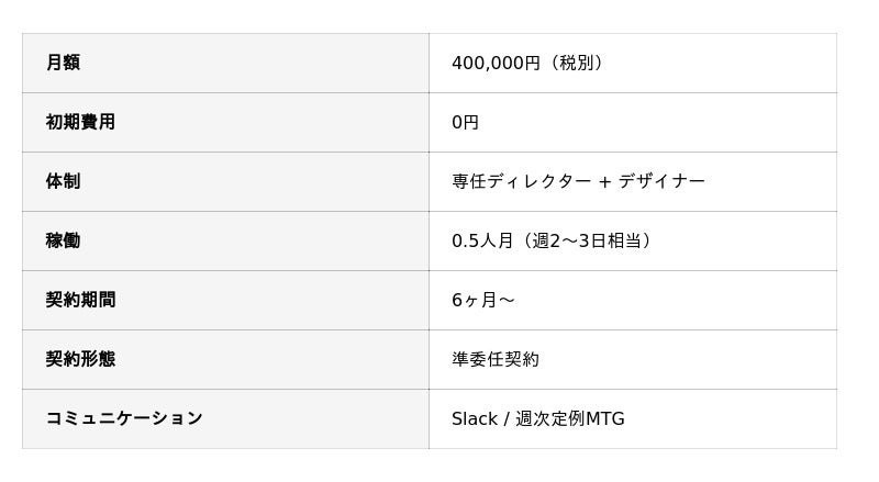 - 大手デザインコンサルティング: 月額100万円~と高額。スタートアップには過剰なスコープ