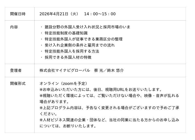 【外国人採用セミナーのご案内】建設業も特定技能外国人受け入れ停止の危機!? 制度と人材市場をわかりやすく解説【4/21(火)14時~オンライン開催】