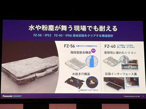 堅牢性について、FZ-56は耐落下90cm、耐高温50度・耐低温-10度、IP53の防塵防滴対応。一方、FZ-40は耐落下180cm、耐高温50度・耐低温-10度、IP66の防塵防滴対応となっており、どちらも過酷な現場での作業を安心して行える。