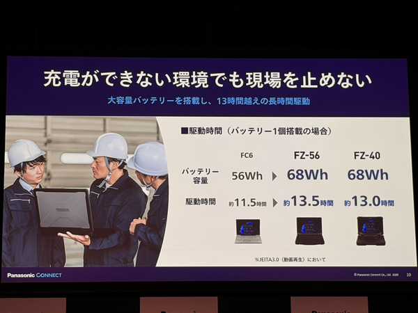 次に駆動時間だが、JEITA 3.0測定法でFZ-56が約13.5時間(68Whバッテリー容量)、FZ-40が約13時間(68Whバッテリー容量)という長時間駆動を実現。現場では電源自体が確保できないシーンもあるため、ホットスワップにも対応しており、電源がオンのままのバッテリー交換も可能だ。