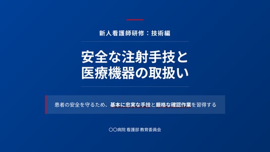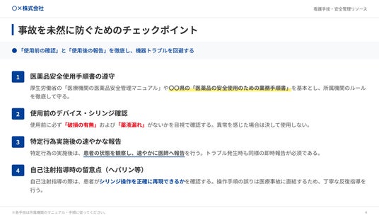 4つ目は「新人向け研修スライド(注射手技等)」です。新人看護師・医療スタッフを対象に、注射手技や医療機器操作の手順をまとめた研修スライドを生成できるサンプルです。4月の新人研修時期に大量の研修資料が必要になりますが、教育担当看護師の通常業務と並行した制作では量産が追いつかないという課題に対応しています。研修テキストや手技マニュアルPDFを素材として投入するだけで、手順ごとの図解付き研修スライドを効率的に作成でき、新人研修時期の資料制作負担を大幅に軽減することが可能です。