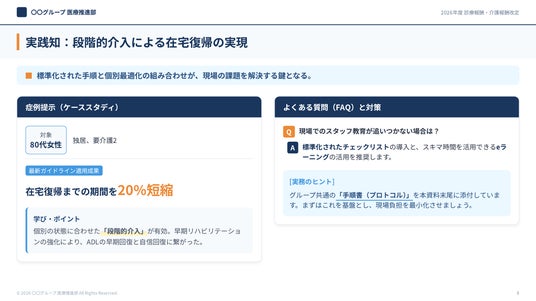3つ目は「ウェビナー・セミナー登壇スライド」です。セミナー参加者(医療従事者・介護関係者)を対象に、最新の医療・介護トピックを解説するスライドを生成できるサンプルです。学会や定期ウェビナーで使う登壇スライドを継続的に作成したいものの、診療業務と並行して質の高い資料を準備するのが難しいという課題に対応しています。公的文書・ガイドラインPDFなどを素材として投入するだけで、登壇向けのスライドを効率的に作成でき、継続的なウェビナー・学会発表の準備にかかる工数を大幅に削減することが可能です。