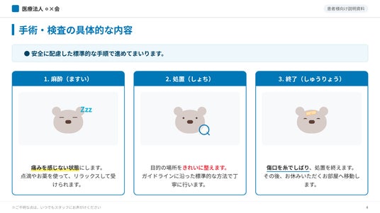 病院・クリニックでは、患者への検査・手術・治療の説明、新人看護師研修、ウェビナー登壇など、医療従事者が「伝える・理解してもらう」ための資料作成業務が日常的に発生します。インフォームドコンセントの重要性が高まる一方、医師・看護師の時間は診療業務で大きく圧迫されており、限られた時間のなかで説明資料の質を維持することが現場の課題となっています。