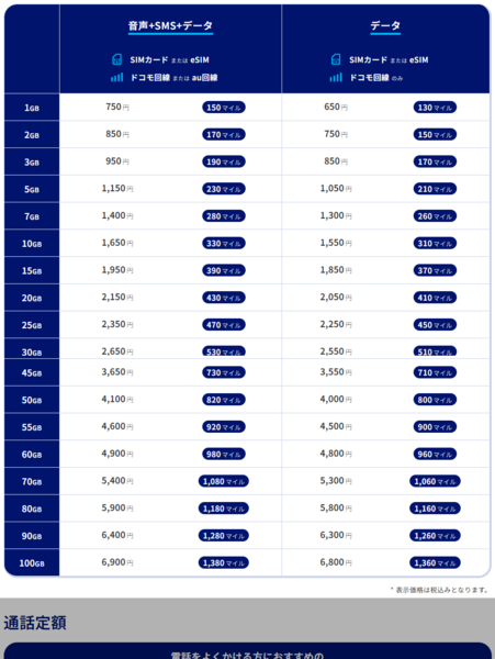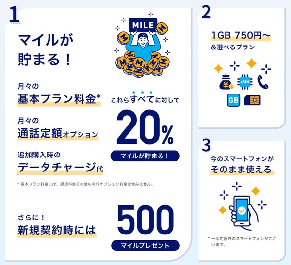 しかし、ここで効いてくるのが20%のマイル付与。2150円のプランなら毎月430マイルが付与されるため、マイルをどう考えるか次第にはなりますが、実質的な価値で考えるとほかの格安SIMに引けを取らない、あるいはそれ以上のコスパが実現されます。