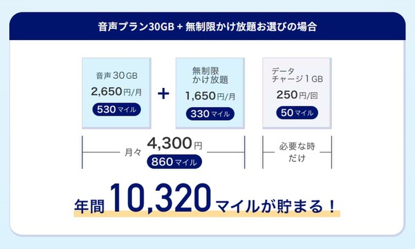 すでに何度も紹介していますが、なんと言っても月額料金の「20%」というマイル還元率が最大の魅力です。たとえば、スマホの基本料金や通話オプションで月4300円を支払った場合、月に860マイル、1年間継続すればなんと「1万320マイル」も貯まる計算です。