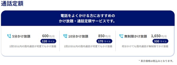 ・無制限かけ放題 月1650円(330マイル)