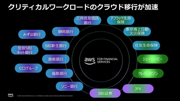 まずは、マイグレーションの進捗だ。現在、日本の金融機関において、AWSのクラウド基盤にミッションクリティカルなワークロードを移行する動きが本格化しているという。