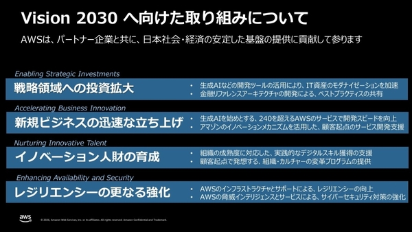 AWSジャパンは、現在、「日本社会・経済の安定した基盤を提供」することを目標に掲げた金融ビジネス戦略「Vision 2030」に取り組んでいる。これは、「戦略領域への投資拡大」「新規ビジネスの迅速な立ち上げ」「イノベーション人財の育成」「レジリエンシーの更なる強化」という4つの柱で展開している。