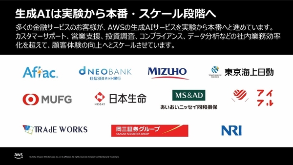 さらに、高性能なエージェントを安全かつスケーラブルに構築・展開・運用するためのAgentCoreも、アフラックを含む様々な金融機関において試用や展開が始まっている。