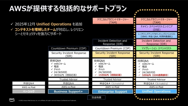また、2025年12月、最上位のサポートプランとして「AWS Unified Operations」を追加している(日本語対応済み)。同プランでは、障害発生時の5分以内のプロアクティブな応答に対応し、顧客の環境を徹底理解した「ドメイン スペシャリストエンジニア」なども加わる。いち早くSOMPOホールディングスが導入している。