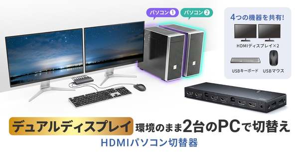 サンワサプライは、デュアルディスプレイ対応の4K対応HDMIパソコン切替器「SW-KVM22HUUS」を発売した。価格21,780円で、2台のパソコンでHDMIディスプレイ2台とUSBキーボード、USBマウスを切り替えて使用できるのが特徴だ。