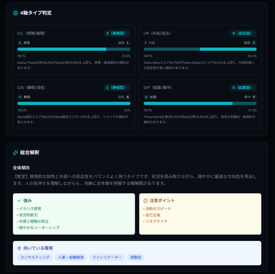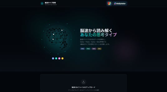 「脳波タイプ診断」は、脳波デバイスで測定した脳波データ(CSVファイル)をアップロードすることで、Delta・Theta・Alpha・Betaの4帯域を分析し、4軸16タイプの思考パターンとして可視化するサービスです。