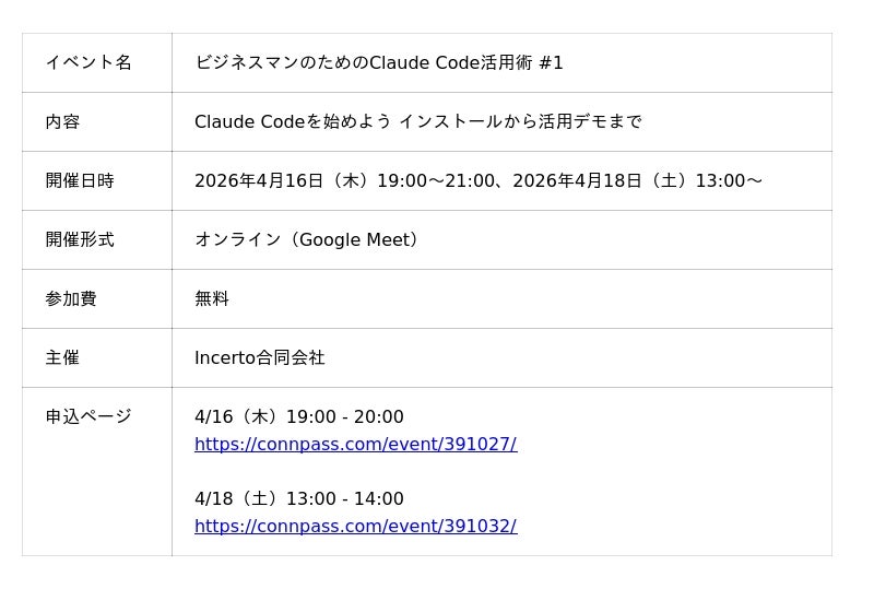 第1回は「ビジネスマンのためのClaude Code活用術 #1」として、2026年4月16日(木)19:00~21:00と4月18日(土)13:00~14:00 の2日程でオンライン(Google Meet)にて無料開催します。