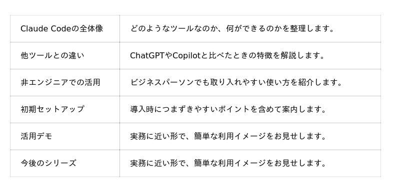 本シリーズは、生成AI、AIエージェント、業務自動化といったテーマを、非エンジニアにも分かりやすく実務へつなげることを目的とした入門企画です。第1回ではClaude Codeを入口に、AIツールを仕事でどう使うかを解説し、今後もビジネスの現場で役立つテーマを継続開催予定です。