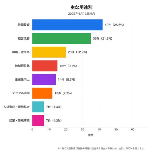 4月第2週の新着164件では設備投資と経営改善の支援が最多で、省エネ・脱炭素テーマの制度が全体の3番目に位置する構成です。